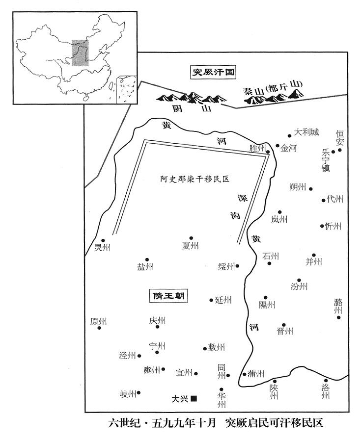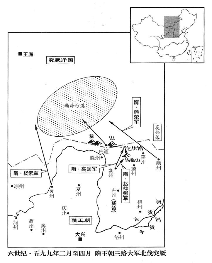 3、突厥汗国(瀚海沙漠群)突利可汗(小可汗)阿史那染干托长孙晟上奏说:都蓝可汗(八任大可汗)阿史那雍虞闾正大肆制造攻城武器,打算进攻大同城(内蒙古乌拉特前旗)。杨坚下令大军三路北伐:汉王杨谅当大军元帅,国务院左执行长(尚书左仆射)高颎从朔州道(山西省朔州市)出发,右执行长(右仆射)杨素从灵州道(宁夏灵武市)出发,上柱国(勋官一级·从一品)燕荣从幽州道(北京市)出发,同时攻击阿史那雍虞闾,全归汉王杨谅(时驻并州“〔山西省太原市〕”)指挥,可是杨谅并不亲临军营(这是南宋帝国所建立的一种奇异指挥方式,参考四三一年闰六月注)。
