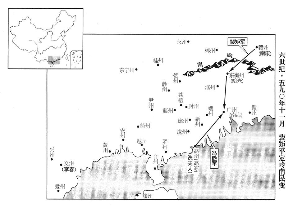 6、番禺(广东省广州市)蛮夷首领(夷王)王仲宣反抗中央,岭南(南岭以南)各蛮夷首领纷纷响应,遂包围广州(番禺)。柱国(勋官二级·正二品)韦洸被流箭射中(韦洸南征事,参考去年“〔五八九年〕”二月),逝世,杨坚下诏,命韦洸的副手慕容三藏摄理广州兵团作战执行官(检校广州道行军事),加派给事郎(散官·正八品上)裴矩,到岭南巡视安抚。裴矩抵达南康(虔州州政府所在县·江西省赣州市),招募士卒,集结数千人。变民首领王仲宣派别动部队将领周师举包围东衡州(广东省韶关市)。裴矩会同大将军(勋官四级·正三品)鹿愿,联合进攻,斩周师举,进逼南海郡(广东省广州市。此时隋王朝没有“郡”级地方政府,但因岭南远在边疆,此时还来不及改制)。