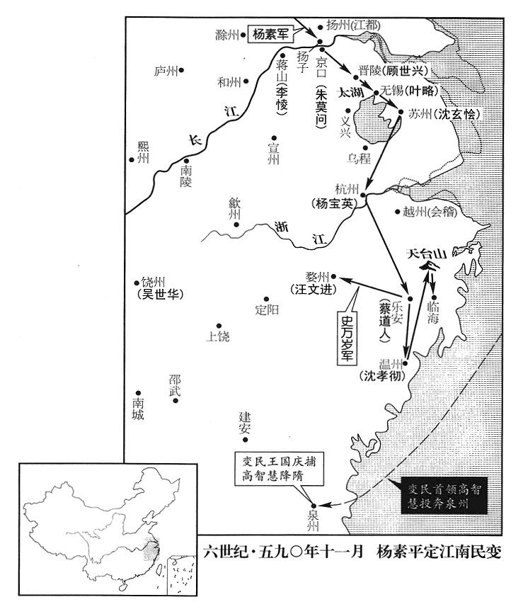 4、江表(江东·太湖流域及钱塘江流域)自晋帝国在建康(江苏省南京市)建立政府(三一七年三月)以来,三百年间,公权力不振,刑法疏阔缓慢,豪门世家高高凌驾寒门平民之上。陈帝国覆亡后,隋朝政府官员一视同仁,对待豪门世家跟对待寒门平民一样。苏威更作《五教》,使民间无论长幼老少全都背诵(《五教》是什么,这个江南全民背诵的政治圣书,今已无人知道,但可推测当是讲解传播尊君思想作品),知识分子及一般平民,全都愤怒怨恨。而民间又突然传出谣言,说隋政府要把他们强行迁移进关(函谷关),无论城镇远近,人心恐惧惊骇。于是民变风起云涌。婺州(浙江省金华市)人汪文进、越州(浙江省绍兴市。此时应称吴州)人高智慧、苏州(江苏省苏州市)人沈玄懀,都聚众起兵,反抗隋王朝政府,各人自称皇帝,设置文武百官。乐安(浙江省仙居县)人蔡道人、蒋山(江苏省南京市东)人李、饶州(江西省波阳县)人吴世华、温州(浙江省温州市。此时应称处州)人沈孝彻、泉州(福建省福州市)人王国庆、杭州(浙江省杭州市)人杨宝英、交州(越南河内市)人李春等,都自称总司令官(大都督)四出攻击,攻陷邻近城池。故陈帝国版图所有州县,几乎全部叛变,变民集团大的有数万人,小的有数千人,互相呼应,逮捕隋政府派任的县长,有的甚至把县长的肠子都抽出来,有的则把县长剁成肉酱吞食,说:“你还能不能教我再背诵《五教》!”
