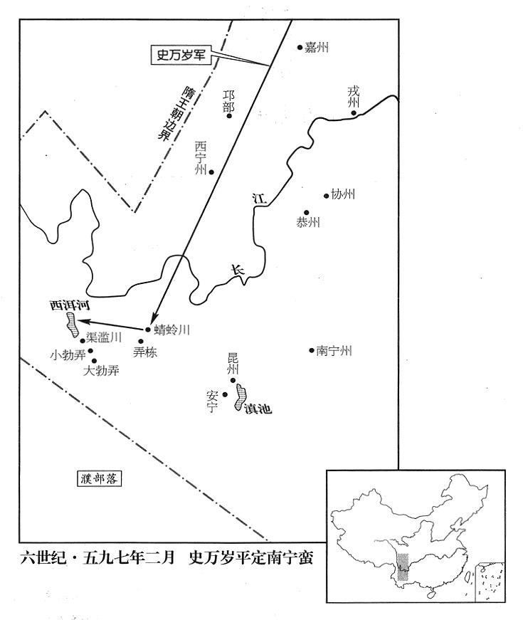 最初,益州军区总司令(益州总管)梁睿攻克王谦时(参考五八〇年十月),西南夷獠(云南省夷民族部落及獠民族部落)全都归降,只有南宁州(云南省曲靖市)酋长爨震(爨,姓。音cuàn“〔窜〕”),认为距中原遥远,不肯屈服。梁睿上疏,认为:“南宁州西汉王朝时属牂柯郡,人口稠密,金银财宝十分富饶。最初,南梁帝国南宁州州长徐文盛被萧绎(南梁帝国四任帝)调回荆州(五四八年十一月,萧绎征调帝国西部各州军队入援江陵“〔荆州州政府所在县·湖北省江陵县〕”,南宁州应在其中),当时中国(指中原)被阻在远方,没有能力经营边疆。民众首领爨瓒遂乘机控制那个地区,政府也只好遥命他当州长。后由他的儿子爨震继承,直到今天。可是,爨震并没有尽到州长责任,既不进贡,又不缴税。梁睿请求出动扫平巴蜀(王谦)的军队,继续南下扫平南宁州。”后来,南宁州民众首领之爨翫投降,政府任命他当昆州(云南省昆明市)州长;不久,爨翫再度背叛。隋帝(一任文帝)杨坚(本年五十七岁)遂决定采取大规模军事行动,命左领军(十二禁军第七军)将军(从三品)史万岁当大军作战总司令官(行军总管),率军进攻,从蜻蛉川(云南省大姚县)进入南中(云南省)。夷民族部落纷纷据守险要,史万岁一一击破;经过《诸葛亮记功碑》(碑在云南雀大理市境·诸葛亮伐南中,参考二二五年七月),渡西洱河(洱海),进入夷民族部落基地渠滥川(云南省大理市以南地区),行军一千余里,击破三十余个部落,俘虏男女二万余人。各夷獠大为恐惧,派出使节,呈献直径超过二寸的明珠,请求投降,杨坚批准。于是,竖立石碑,歌颂隋政府的功德。史万岁请求携带爨翫到京师(首都大兴)朝见,杨坚同意。可是爨翫另有阴谋,不想前往中央,贿赂史万岁很多金银财宝,史万岁遂留下爨翫,单独班师。