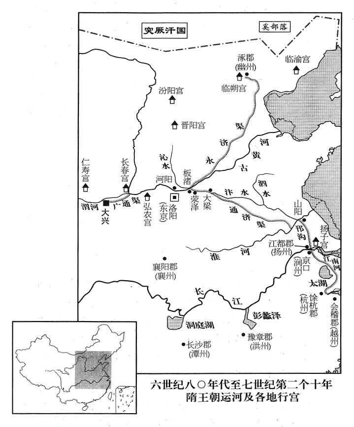 三月二十一日,杨广命国务院事务秘书长(尚书右丞)皇甫议召集河南(黄河以南)、淮北(淮河以北)各州民夫,前后一百余万,开凿通济运河(通济渠)。自洛阳西苑,引导穀水、洛水,注入黄河。再从板渚(河南省荥阳市北)引导黄河,穿过荥泽(河南省郑州市西北),注入汴河,在大梁(河南省开封市)之东,再注入泗水,再注入淮河。更征调淮南民夫十余万人,挖掘古邗沟(邗,音hán“〔寒〕”),从山阳(江苏省淮安市)到扬子(江苏省扬州市南长江渡口),注入长江(一任帝杨坚时,曾疏浚邗沟,参考五八七年四月)。运河宽四十步,河旁都修筑御道,种植杨柳。自大兴到江都(扬州·江苏省扬州市),设立行宫四十余处。