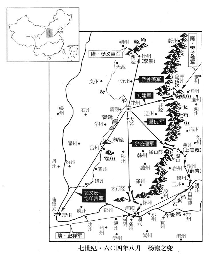 杨谅大为兴奋,派他任命的大将军(勋官四级·正三品)余公理从太谷(山西省太谷县)出发,前往河阳(河南省孟州市);大将军綦良,从滏口(太行八陉之四·河北省武安市西南)出发,前往黎阳(河南省浚县);大将军刘建,从井陉(大行八陉之五·河北省井陉县西)出发,夺取燕赵地区(河北省);柱国(勋官二级·正二品)乔钟葵从雁门(代州·山西省代县)出发(当时,李景据代州,不服从杨谅);任命裴文安当柱国,会同另一柱国纥单贵、王聃(音dān“〔丹〕”)等,率军直指京师。