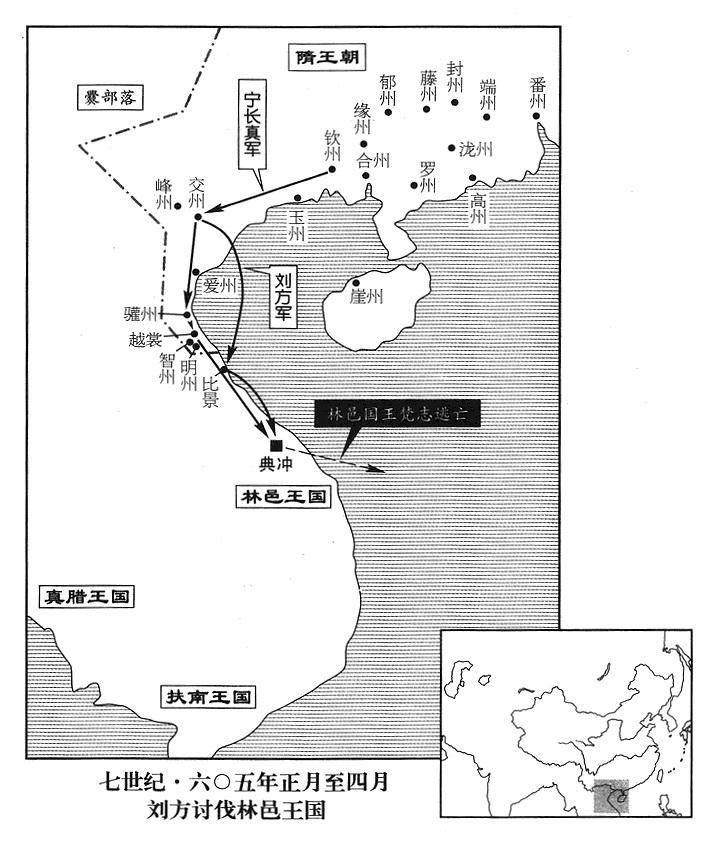 5、一任帝杨坚末年,文武百官中有人传说林邑王国(越南中部)出产奇珍异宝。当时,天下一片升平,全国无事。交州兵团作战司令官(交州道行军总管)刘方刚刚削平交州(越南河内市东北北宁府)民变,杨坚立即命他当驩州(越南荣市)兵团作战司令官(驩州道行军总管),南下征服林邑王国。刘方派钦州(广西钦州市)州长宁长真等率步骑兵一万余人,从越裳(越南甘禄县)出发,刘方亲率大将军张忿(音xùn“〔训〕”)等,率领舰队,从比景(越南筝河口)出发。