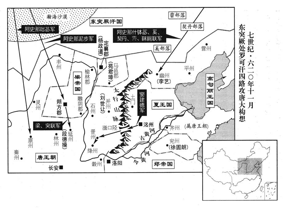 唐政府大军作战司令(行军总管)史万宝向甘泉宫进军(甘泉宫在陕西省淳化县,此处显然有误,当是显仁宫,显仁宫在甘裳县,今河南省宜阳县境)