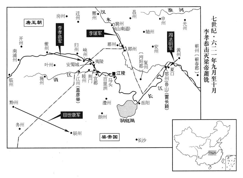唐帝李渊动员巴蜀军队,任命赵郡王李孝恭当荆湘道(湖北省中西部及湖南省)大军作战司令,李靖摄理大军秘书长(摄行军长史),指挥十二个作战司令,自夔州(重庆市奉节县)顺长江东下。任命庐江王李瑗当荆郢道(湖北省中部)大军元帅(《新唐书·李瑗传》记载,此时李瑗是山南东道“〔秦岭以南〕”中央特遣政府右执行长“〔行台右仆射〕”,驻襄州“〔湖北省襄樊市〕”)。派黔州(重庆市彭水县)州长田世康向辰州道(湖南省沅陵县)进发,黄州军区(总部设湖北省新洲县)总司令(黄州总管)周法明向夏口道(湖北省武汉市)前进,攻击梁政府边界。