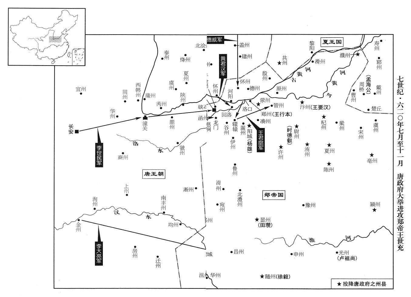 18、四月二十七日,唐政府怀州军区(总部设河南省济源市西黄河北岸)总司令(怀州总管)黄君汉在西济州(河南省济源市)攻击郑政府太子王玄应、大破郑军。熊州(河南省宜阳县西)大军作战司令(行军总管)史万宝在九曲(宜阳县北)突击,再大破郑军。