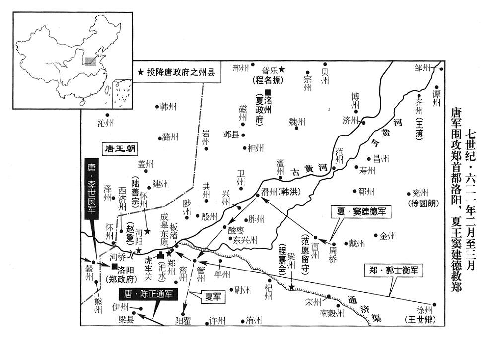 2、李世勣(徐世勣)密谋:一旦夏王窦建德(首都洺州“〔河北省永年县东南旧永年镇〕”)抵达河南(黄河以南),就偷袭他的大营,诛杀窦建德,希望找到老爹李盖(徐盖),连同夏国国土,一起回归唐政府(首都长安)。不巧,窦建德的妻子曹皇后生产,延误很久,不能抵达。