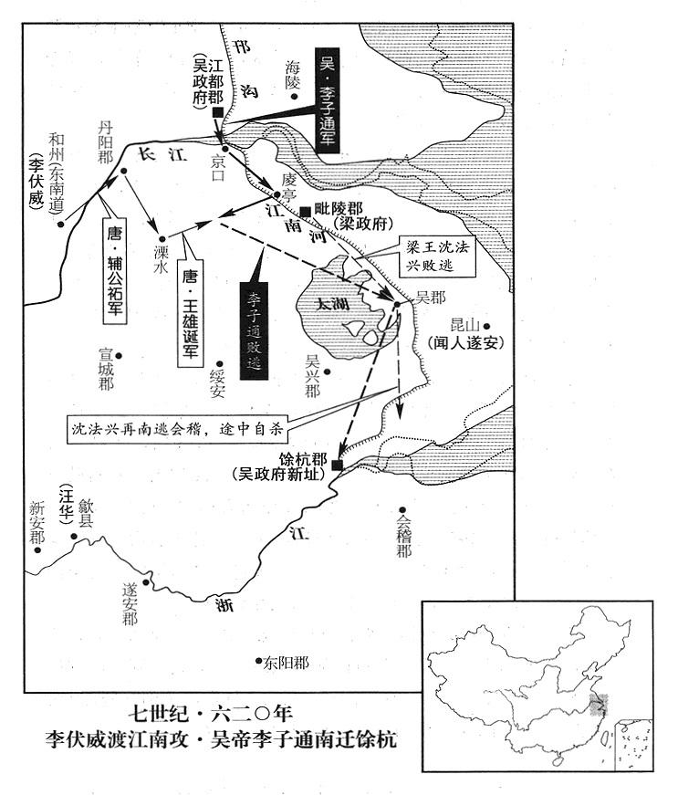 79、唐政府吴王李伏威(杜伏威)派部将王雄诞进攻吴帝李子通(首都馀杭“〔浙江省杭州市〕”),李子通派精锐部队防守独松岭(浙江省安吉县南)。王雄诞命部将陈当世率一千余人,居高临下进逼,到处竖立军旗,夜晚则把大量火炬绑到树上,布满山野荒泽。李子通恐惧,焚烧大营,退守杭州(即馀杭郡·浙江省杭州市),王雄诞追击,在杭州城下,再击败李子通军。