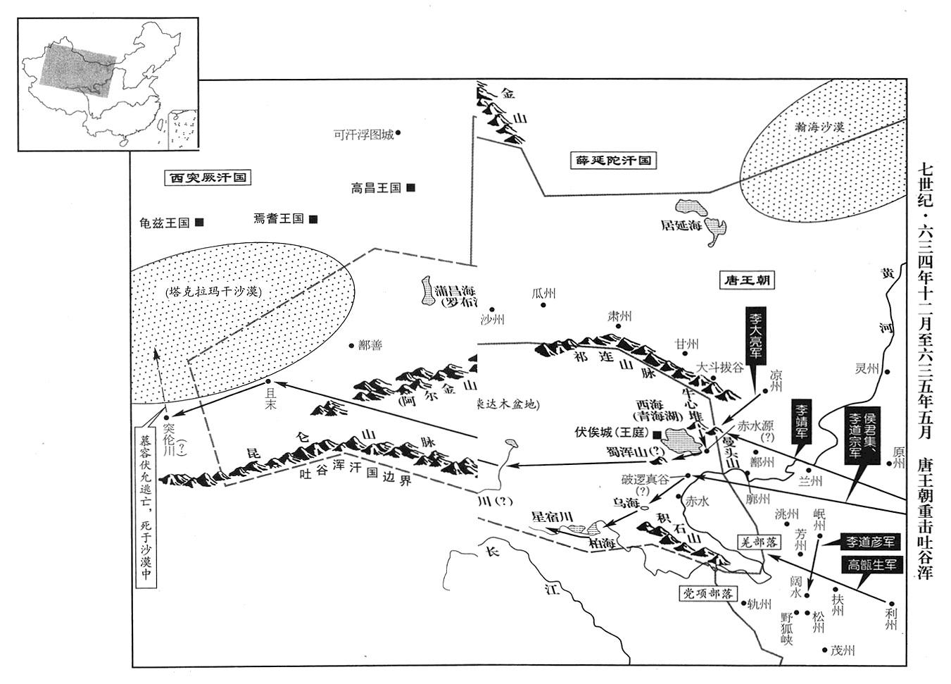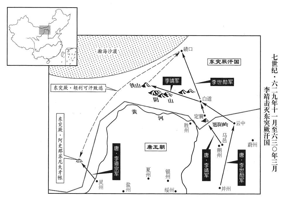 3、二月八日,远征军定襄道作战司令(定襄道行军总管)李靖,追到阴山,击破东突厥颉利可汗(十三任大可汗)阿史那咄苾大军。