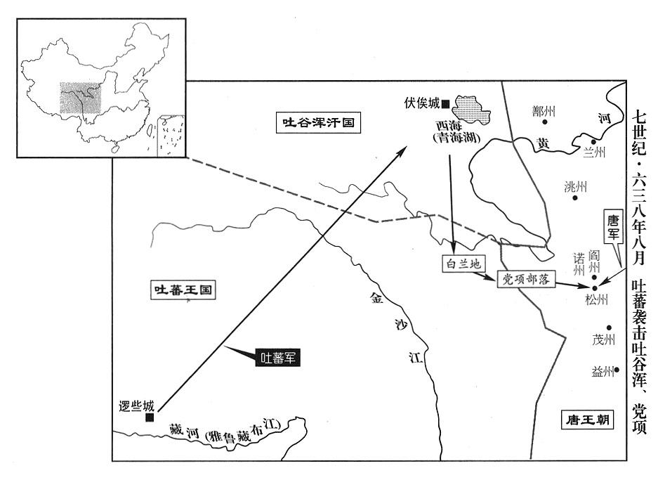 吐蕃军进击党项(四川省西北部)、白兰(青海省西南部)地区各羌民族部落,率部众二十余万人,进入松州(四川省松潘县)西境,派使节携带金银绸缎,到首都长安(陕西省西安市)进贡,声称迎接公主。不久,吐蕃军即进攻松州,击败松州军区总司令(松州都督)韩威。羌民族部落首长、阎州(松潘县北)州长别丛卧施(别丛,复姓),诺州(松潘县北)州长把利步利(把利,复姓),同时献出州城,投降吐蕃。战争连年不停,吐蕃王国高级官员建议国王休兵,却被拒绝,因而上吊身死的,有八人之多。
