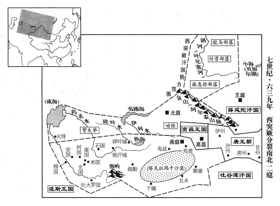 26、西突厥汗国(新疆北部及中亚细亚)咥利失可汗(七任大可汗)阿史那同娥的部属俟利发,跟乙毗咄陆可汗(八任大可汗)阿史那欲谷私通,阴谋政变,阿史那同娥束手无策,逃到汗(中亚细亚安集延),逝世。西翼防区(弩失毕)各部落迎接他的侄儿阿史那薄布公爵继任可汗,称乙毗沙钵罗叶护可汗(九任大可汗)。阿史那薄布公爵登基后,在虽合水(新疆焉耆县北)建立中央政府,称“南庭”,龟兹(新疆库车县)、鄯善(新疆鄯善县)、且末(新疆且末县)、吐火罗(中亚细亚汗阿巴德)、焉耆(新疆焉耆县)、石国(中亚细亚塔什干Tashkent)、史国(中亚细亚沙赫里夏勃兹)、何国(撒马尔罕Samarkand西)、穆国(撒马尔附近)、康国(非康居王国。撒马尔罕)等国归附。而阿史那欲谷(八任大可汗)则在镞曷山(今地不详)西,建立中央政府,称“北庭”,厥越失(今地不详)、拔悉弥(科布多盆地乌布沙泊西岸)、驳马(今地不详)、结骨(萨彦岭北)、火燖(中亚细亚纽库斯Nukus)、触水昆(今地不详)等国归附。