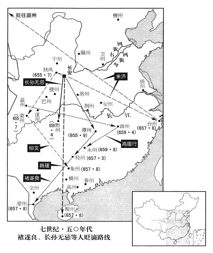 八月十一日,李治下诏贬韩瑗当振州(海南省三亚市西崖城镇)州长,来济当台州(浙江省临海市)州长,终身不准到京师(首都长安)朝见。再贬褚遂良当爱州(越南清化市)州长,荣州(四川省荣县)州长,柳奭当象州(广西象州县)州长。