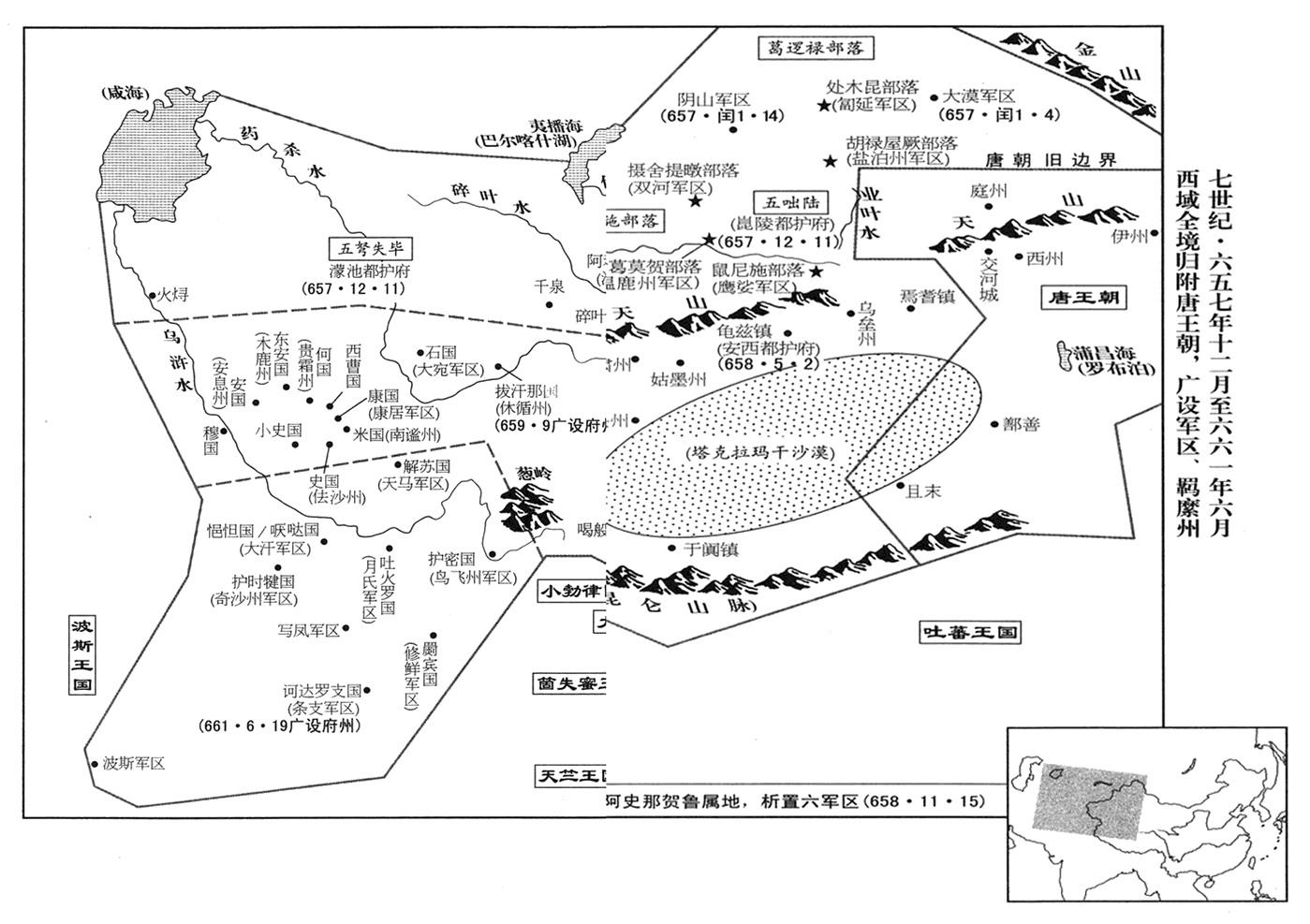 12、九月,李治下诏,在石国(乌兹别克斯坦塔什干市)、米国(中亚朱马巴札尔城)、史国(乌兹别克斯坦萨赫里萨布兹)、大安国(乌兹别克斯坦布哈拉市)、小安国(东安国·乌兹别克斯坦纳沃伊市)、曹国(西曹国·乌兹别克斯坦伊什特汗城)、拔汗那国(乌兹别克斯坦纳曼干市)、悒怛国(即嚈哒国·阿富汗北部马扎里沙里夫城)、疏勒国(新疆喀什市)、朱驹半国(即朱俱波国·新疆叶城县)等国,设一百二十七个“州”“县”“军区总部(府)”。(以上的石国、米国、史国、大安国“〔安国〕”、曹国,加上康国“〔乌兹别克斯坦撒马尔汗〕”、何国“〔乌兹别克斯坦阿克塔什城〕”、火寻国“〔中亚纽库斯〕”、戊地国“〔穆国·土库曼斯坦查尔朱城〕”,共九国,合称“昭武九姓”)。