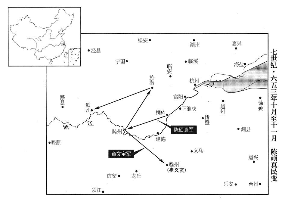 6、最初,睦州(浙江省淳安县)女子陈硕真妖言惑众,跟妹夫章叔胤聚众起兵,自称文佳皇帝,命章叔胤为国务院最高执行长(仆射)。