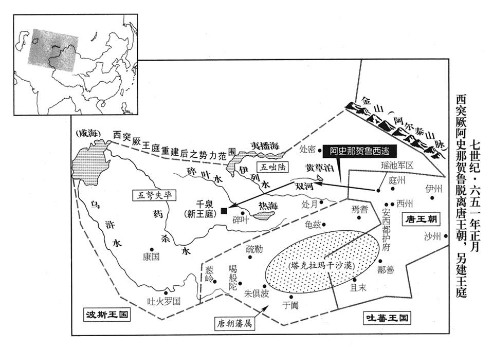 最初,右卫(卫军第二军)大将军阿史那弥射及族兄左屯卫(卫军第九军)大将军阿史那步真,都是西突厥的酋长,二任帝李世民在位时,率领部众向唐帝国投降。现在,李治下诏任命阿史那弥射、阿史那步真分别担任流沙道(新疆塔克拉玛干沙漠四周)安抚特使,从南向北迂回,沿途招收集结他们的旧日部属。