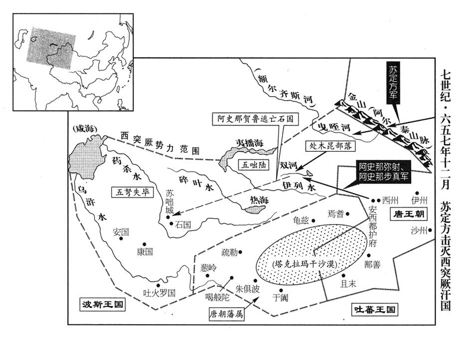 15、西方远征军伊丽兵团总司令官(伊丽道行军总管)苏定方,攻击西突厥汗国(新疆东北部及中亚东部)沙钵罗可汗(十一任大可汗)阿史那贺鲁,进抵金山(新疆阿尔泰山)之北,先攻击处木昆部落(新疆和布克赛尔县),大破处木昆军,处木昆军司令官(俟斤)懒独禄等,率一万余帐向远征军归附;苏定方加以安抚,征调处木昆骑兵一千人,随远征军西进。