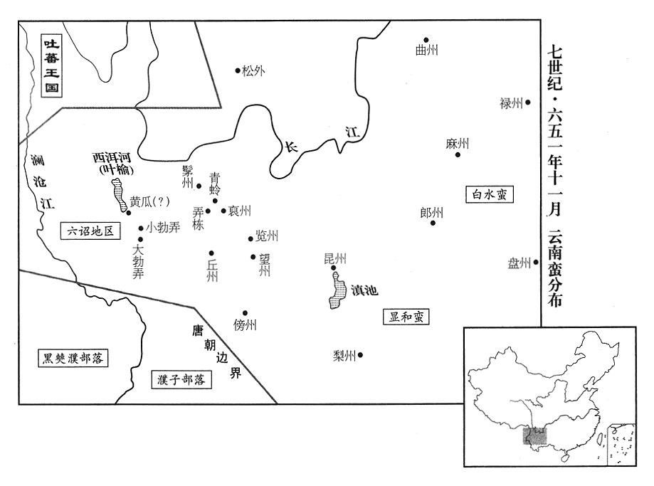 17、郎州兵团(云南省曲靖市)总司令(郎州道行军总管)赵孝祖讨伐白水蛮,酋长秃磨蒲及俭弥于率部众拒守险要抵抗,赵孝祖把他们击破,诛杀。正巧又逢大雪,蛮夷饥寒交迫,几乎死光。赵孝祖上疏说:“三〇年代讨伐昆州乌蛮(云南省昆明市少数民族),开拓疆土,在青蛉(云南省大姚县)、弄栋(云南省姚安县)分设州县(六三七年,在青蛉置絮州,在弄栋置裒州)。弄栋以西有小勃弄(云南省弥渡县北)、大勃弄(云南省弥渡县)两大盆地(六二四年,在大勃弄设南云州;六三四年改名匡州),时常对弄栋诱惑煽动,要弄栋背叛唐帝国。勃弄(云南省弥渡县)西部,跟黄瓜(可能是云南省大理市南境)、叶榆(云南省大理市东北)、西洱河(洱海)接壤,人口众多,物产富庶,比蜀川(四川省)还多,可是,部落林立,没有一个共同君王,互相间喜爱结仇报怨。现在,最好是使用击破白水(云南省富源县)的大军,顺便向西征讨安抚。”李治批准。